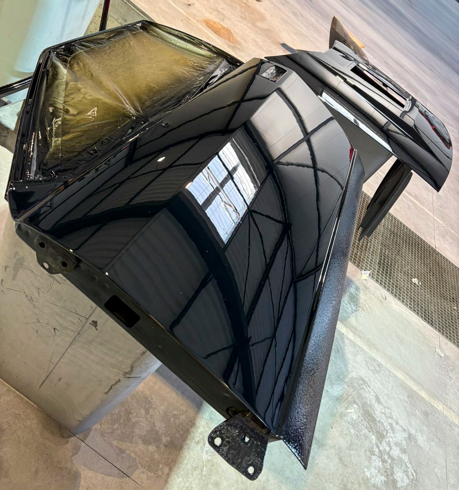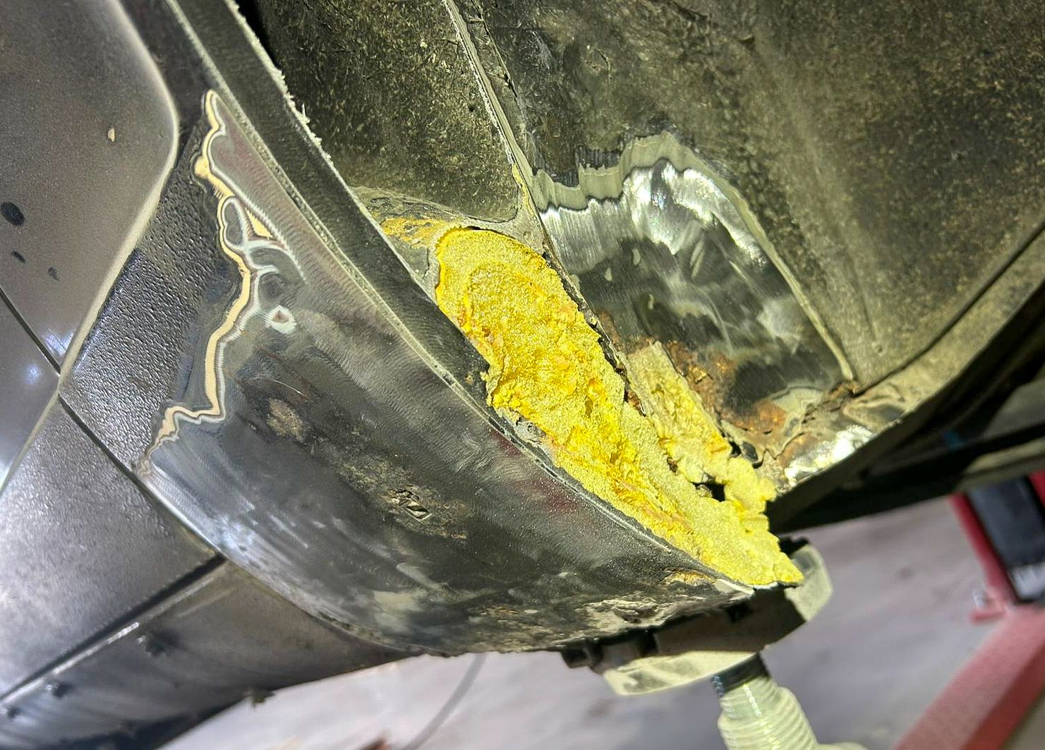 En effet, ce carrossier du “dimanche”, avait utilisé de la mousse expansive pour remplir le pied d’aile et avait reconstitué la tôle manquante par de la “choucroute”.