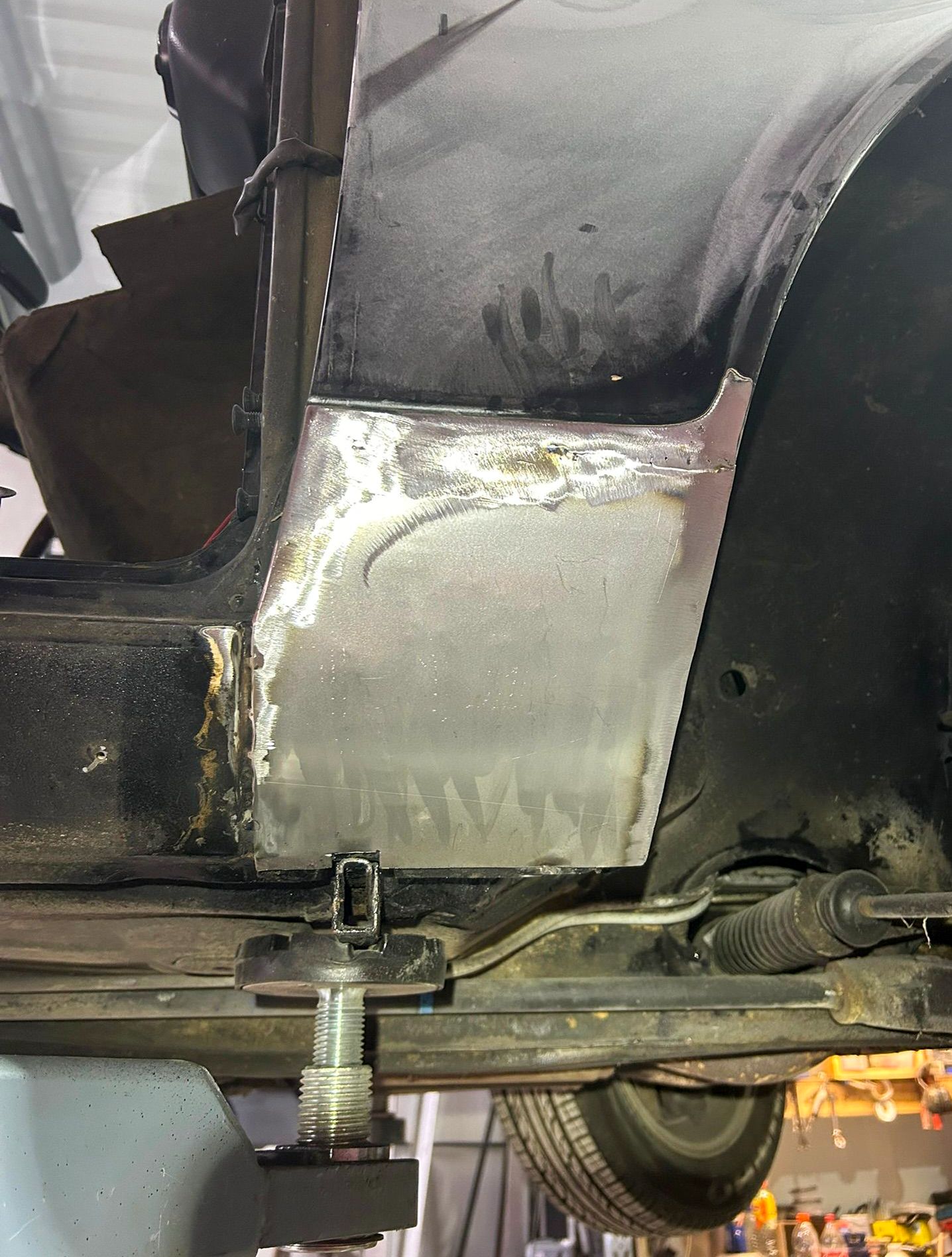 Il a dû donc tout découper et refaire les pieds de bas de caisse dans les règles de l’art avec des tôles de réparation.